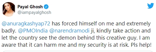 The model-turned-actor has accused Kashyap of sexual misconduct. "Anurag Kashyap has forced himself on me and extremely badly. PMO India, Narendra Modi, kindly take action and let the country see the demon behind this creative guy. I am aware that it can harm me and my security is at risk. Pls help." she wrote in her tweet urging the PMO to take action against the filmmaker.